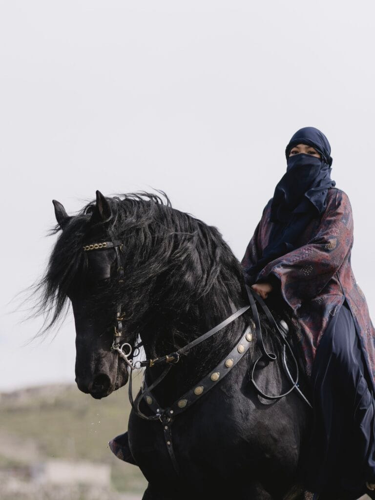 This is a prestigious shooting concept featuring Friesian horses, known for their noble posture and striking black color.