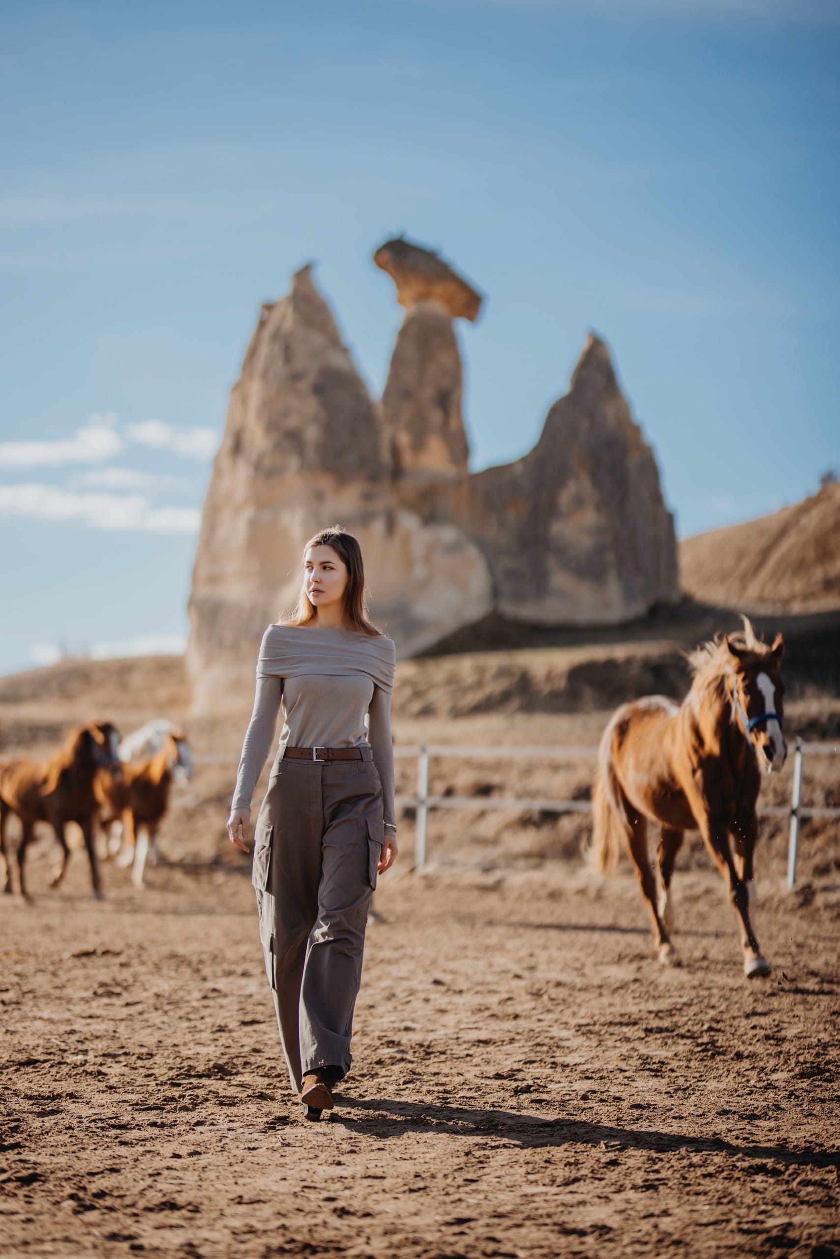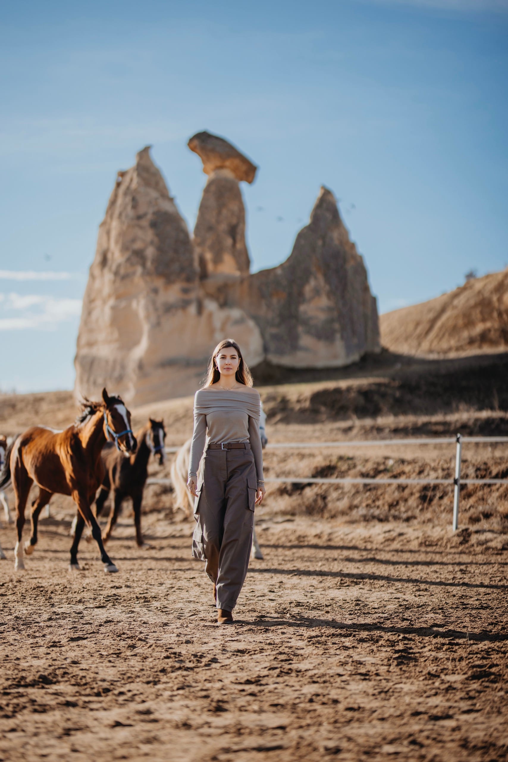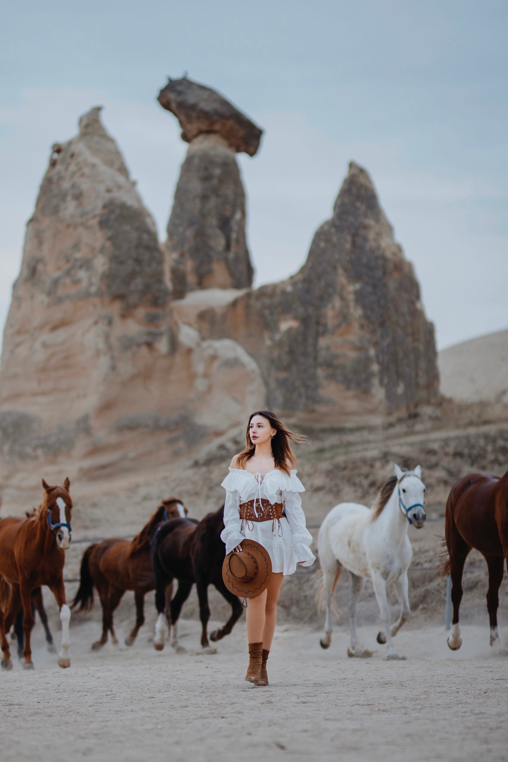 This is a dynamic shooting concept featuring running horses against the iconic Cappadocia landscape, with fairy chimneys in the background.